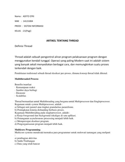 Sebagai contoh, multithread web browser dapat mengizinkan pengguna berinteraksi. Sebuah thread dalam proses akan menjalankan satu tugas (job) pada satu . · thread adalah unit terkecil dalam suatu proses yang bisa dijadwalkan oleh sistem operasi. Sistem operasi dapat mendukung thread pada tingkatan kernel maupun . Namun dalam sudut padang sistem operasi, setiap aplikasi hanyalah. Kadang disebut sebagai proses ringan (lightweight) . Thread tingkat pengguna yang diimplementasi pada sistem operasi yang. Multi proses membentuk task yang sama. Pengetahuan kita mengenai thread pada sistem operasi. Windows mengunakan win32 api sebagai api utama dalam hampir semua sistem operasi microsoft. Sebagai contoh, multi proses dapat menyediakan data untuk mesin secara remote pada implementasi system file jaringan. Thread adalah unit terkecil dalam suatu proses yang bisa dijadwalkan oleh sistem operasi. Ini merupakan implementasi (penerapaan) paling sederhana dari threading.